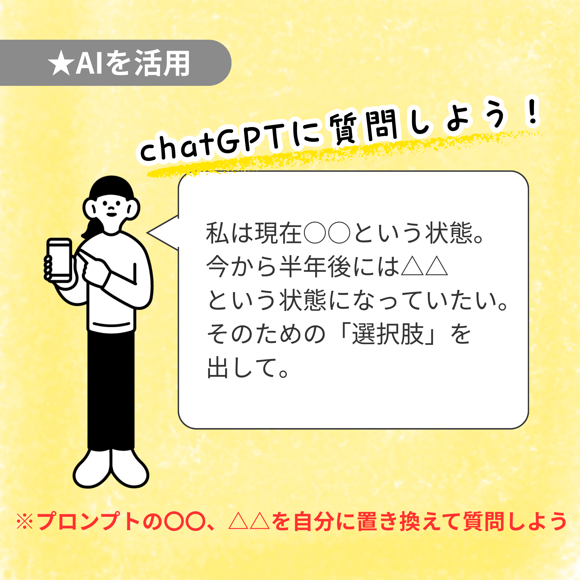 私は現在○○という状態。今から半年後には△△という状態になっていたい。そのための「選択肢」を出して。